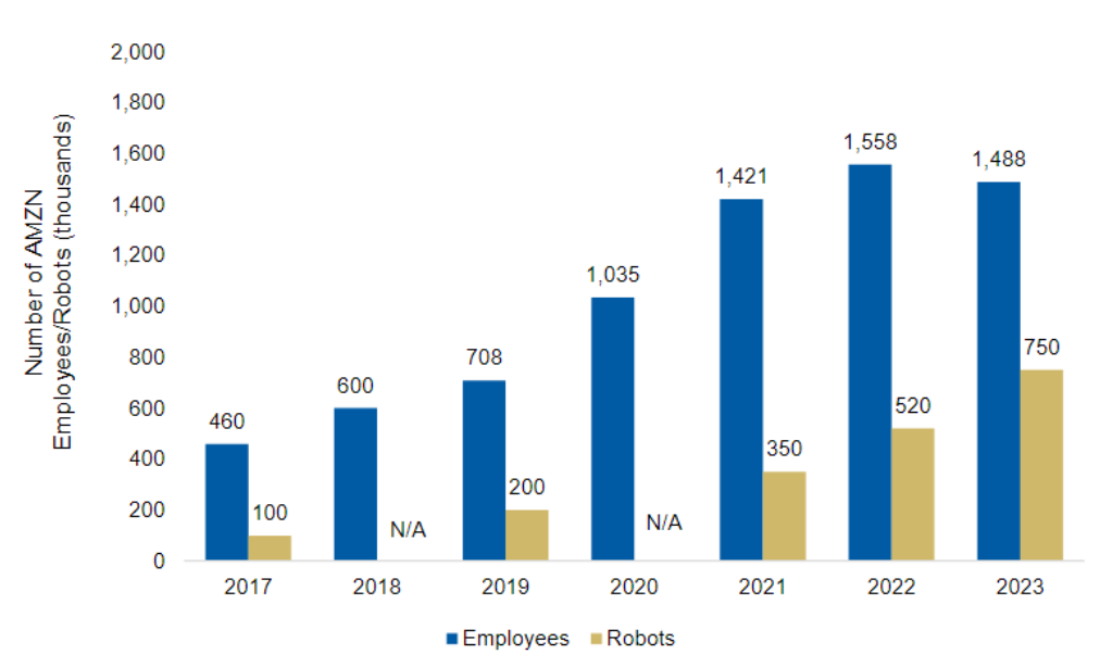 此外,具身智能对管事的冲击也迫害苛刻。以亚马逊为例,其仓库机器东说念主数目从2017年的10万台激增至2023年的75万台,同期职工与机器东说念主的比例从约4.5:1下落至约2:1。
