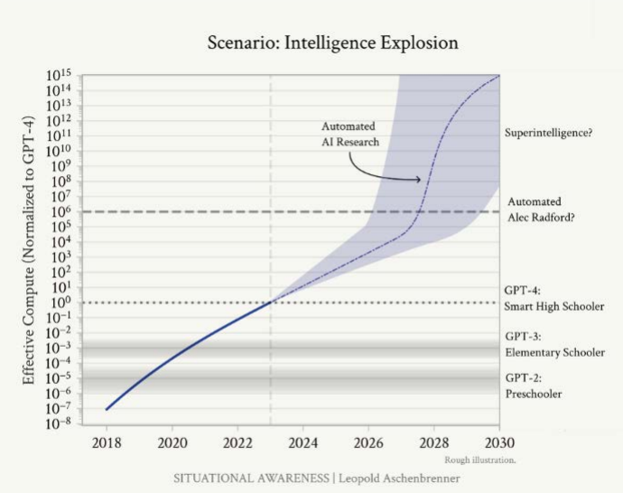另一位想想家Leo Aschenbrenner在其论文《Situational Awareness》中也提供了遍及笔据,他预测,改日四年内,咱们将见证又一次从GPT-2到GPT-4量级的质的飞跃。