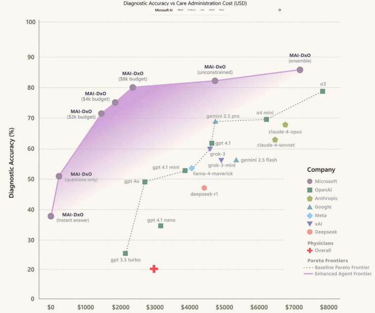 为了佐证这一不雅点,敷陈还列举了微软的医学AI案例:其AI会诊系统(MAI-DxO)在会诊《新英格兰医学杂志》真的病例时的正确率高达85%,是教育丰富的大夫群体的四倍以上。